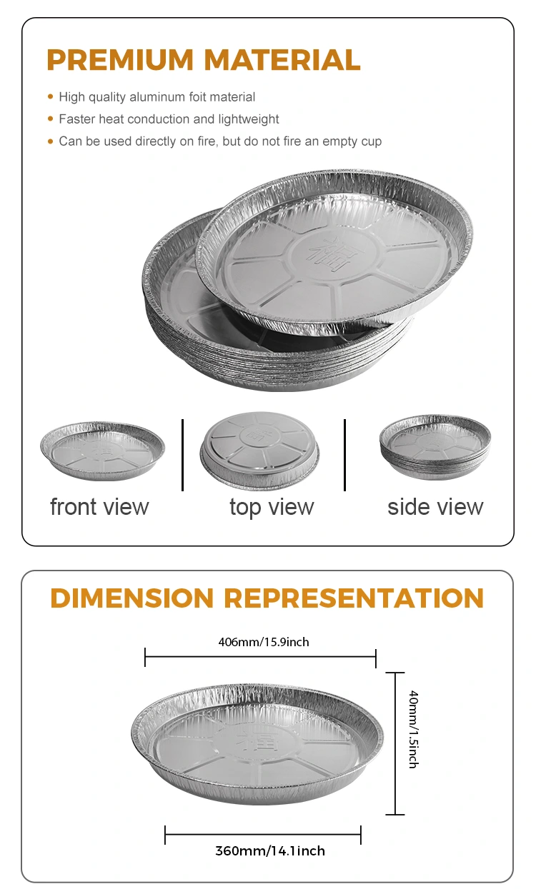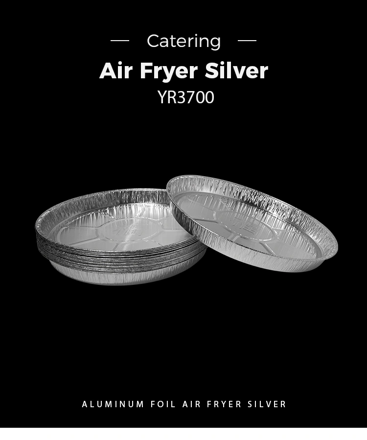 Yunchu Aluminiumsfolie Leverandør Model YR3700 Disponable Air Fryer Ovn Silver Aluminium Folie Food Container leveres. Beholderen har en diameter på 406 mm (ca. 15,9 inches) øverst, 360 mm (ca. 14,1 inches) i diameter i bunden, en højde på kun 40 mm (ca. 1,5 inches) og en kapacitet på ca. 3.700 ml (ca. 130,5 oz). Åben flamme dampning er praktisk og hygiejnisk, ovnbagning, høj temperaturresistens 400 ° C er ikke brændt eller brudt, ovnbagning er ikke klistret, ikke bange for fedtet og forsætlig grill på grund af dens evne til direkte at kontakte åbne flammer, brugerne behøver ikke at bekymre sig om sikkerhedsspørgsmål. Aluminiumsfoliebeholdere er resistente over for høje temperaturer, meget modstandsdygtige over for bagning og er ikke lette at brænde eller bryde. Kanten af ​​fuld rulle er oliefri, hvilket forhindrer, at mad klæber til væggen i gryden, og beskyttelsen er mere intim.
