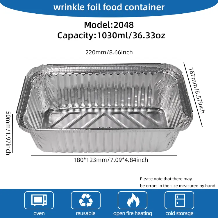 Yunchu Aluminium Foil Factorys engangsgrillbagning madkasse sølv aluminiumsfoliebeholder er lavet af høj renhed fødevarekvalitet aluminiumsfolie. Det er ikke-giftigt og smagløst, modstandsdygtigt over for høj temperatur og lav temperatur. Smeltepunktet er så højt som 250°C. Det kan være i direkte kontakt med fødevarer. Det frigiver ikke skadelige stoffer, når det opvarmes ved høje temperaturer. Den kan også bevare en stabil form, når den er nedkølet og frosset. Det er et engangsdesign og kan smides ud efter brug. Ingen grund til at bruge tid på at rense tallerkener og bradepander, fuldstændig afgiftende Det løser det kedelige problem med rengøring efter måltider, og er især velegnet til scener som sammenkomster med mange mennesker og udendørs rejser. Det opgraderede fortykkede aluminiumsfoliemateriale har en solid tekstur og stærk støttekapacitet. Det er ikke let at lække eller deformeres, når man holder retter med supper eller tunge grillingredienser. Kanterne er glatte og gratfri, hvilket gør den mere sikker at bruge. Den er også velegnet til ovne, frituregryder, dampkogere og andre køkkenredskaber, og madlavning og servering kan klares i ét trin.