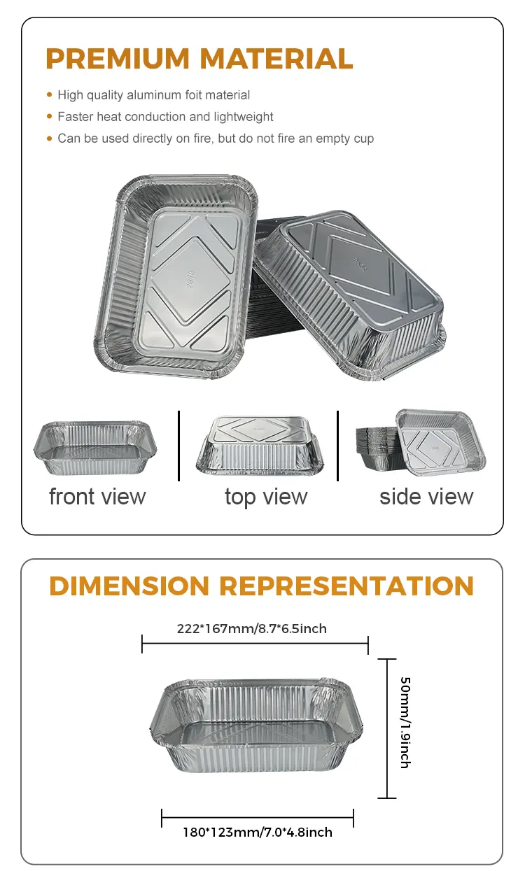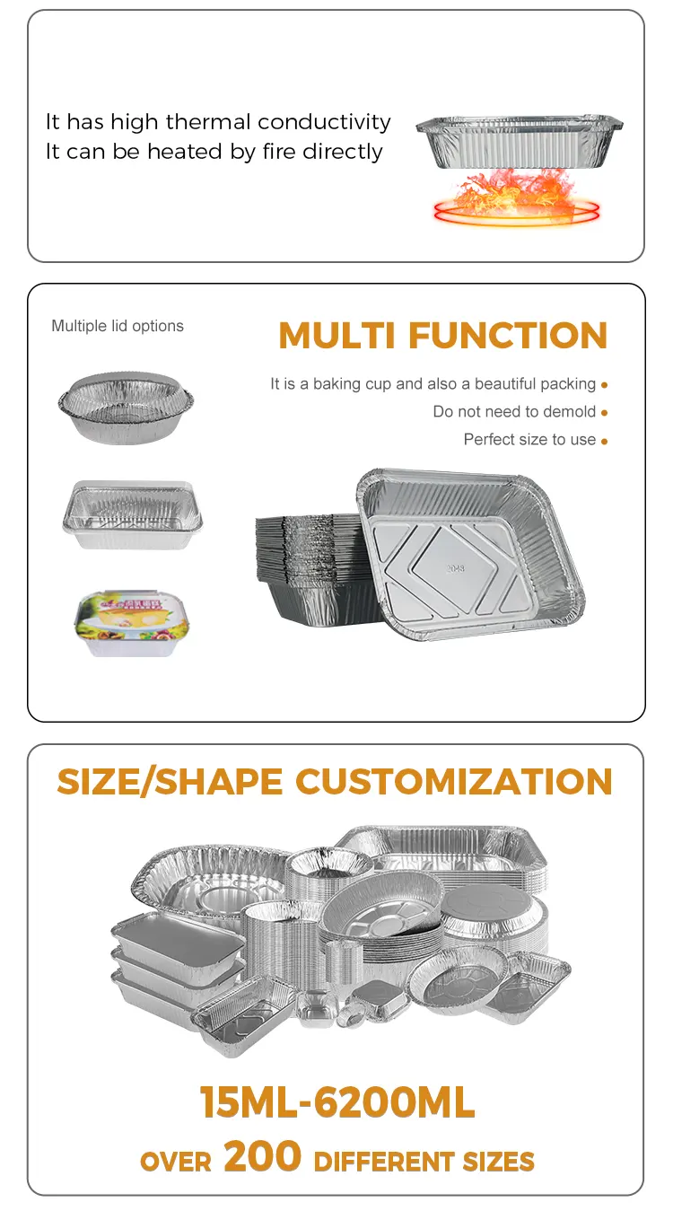 Yunchu Aluminium Foil Factorys engangsgrillbagning madpakke sølv aluminiumsfolie beholder er velegnet til de fleste scener, uanset om det er en grillrestaurant, en vestlig restaurant, en hjemmelavet restaurant eller et bageri, denne sølv aluminiumsfolie madpakke kan forbedre effektiviteten. Grillrestauranter kan bruge den direkte til at servere grillspyd, grillede grøntsager og grillet fisk og skaldyr. Det sølvfarvede udseende er parret med de duftende ingredienser. Den har en fuld visuel effekt og er iøjnefaldende, når den serveres. Det no-clean design reducerer arbejdsbyrden ved opvask i køkkenet og sparer arbejdsomkostninger. Den er især velegnet til hurtige måltider i spidsbelastningsperioder. Bagerier bruger det til at servere bagte kager, æggetærter og kiks. De kan bages direkte i ovnen og skal ikke bages efter bagning. At skifte tallerkener og placere dem direkte til salg er praktisk, samtidig med at temperaturen og formen på desserter bevares; hjemmelavede restauranter kan bruges til takeaway, og det lækagesikre design kan effektivt forhindre suppe i at spilde. Varmekonserveringen af ​​aluminiumsfolie kan forlænge madens konstante temperaturtid. Til camping, picnic, udendørs grill og besværet med at bære omfangsrigt service og rengøring efter måltider, løser denne engangs madpakke af aluminiumsfolie perfekt smertepunkterne ved udendørs rejser. Materialet er tyndt og let, og det er nemt at opbevare. Den kan foldes og stables efter eget ønske, og den optager ikke plads i din rygsæk og gør den problemfri at bære.