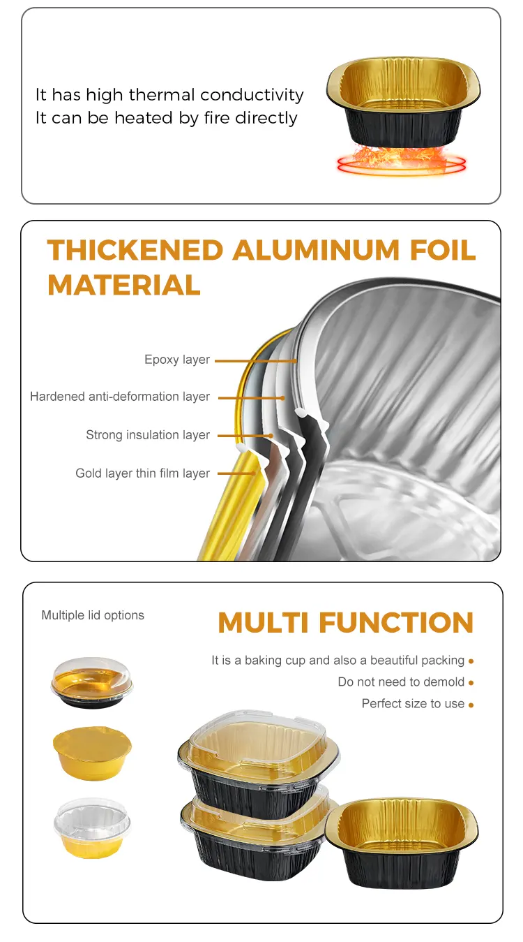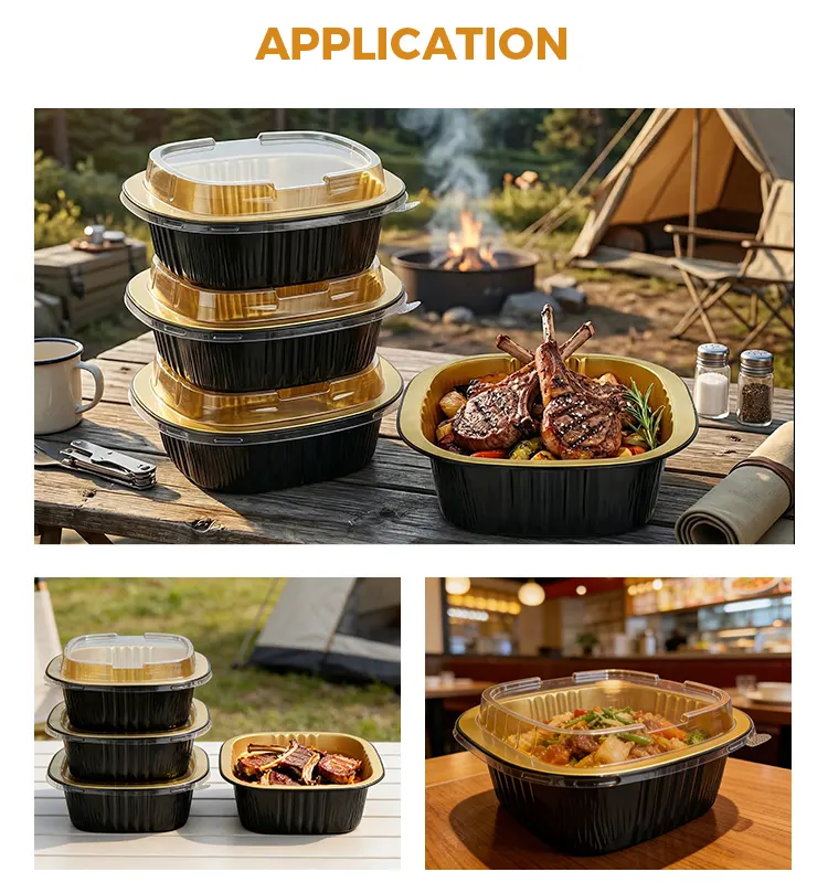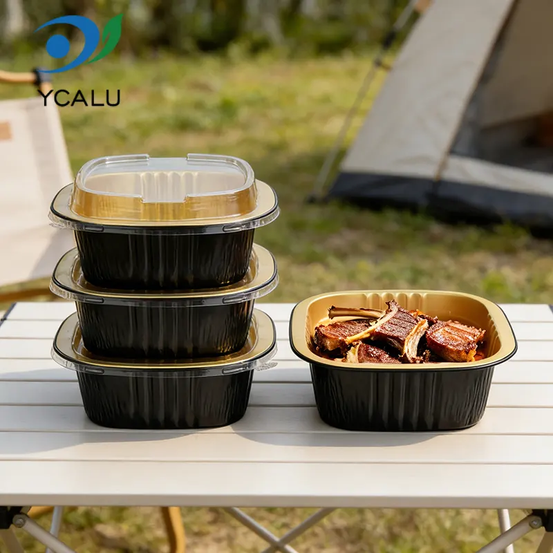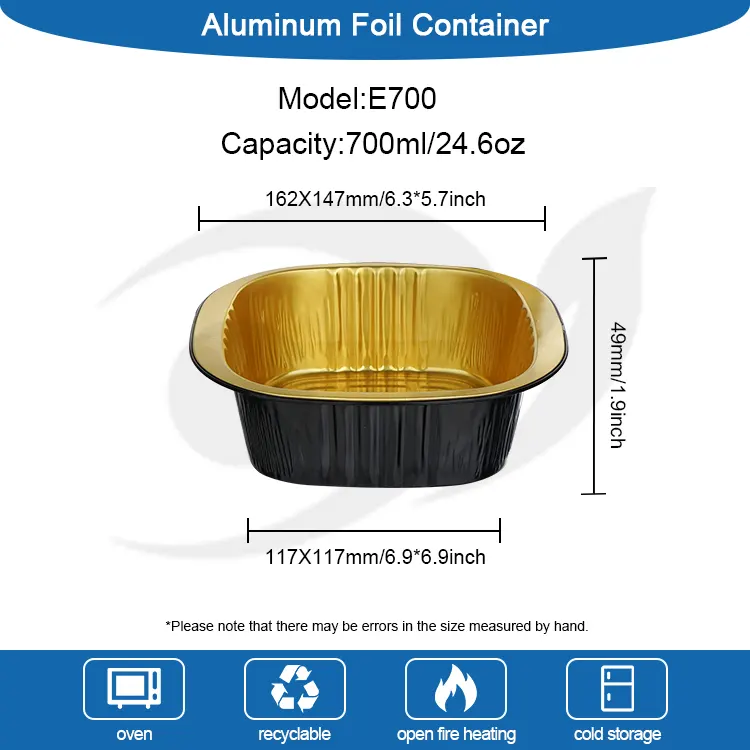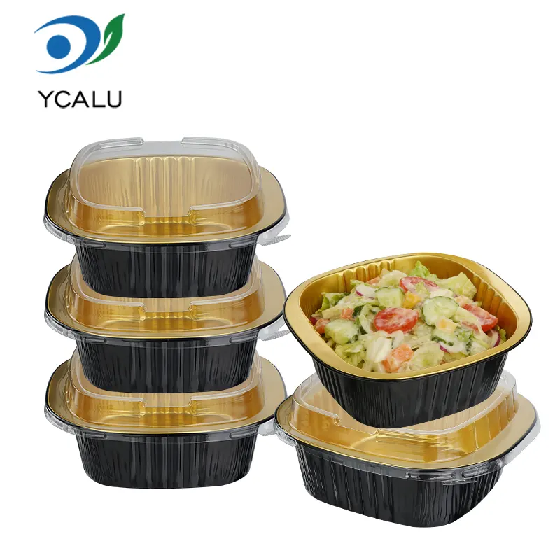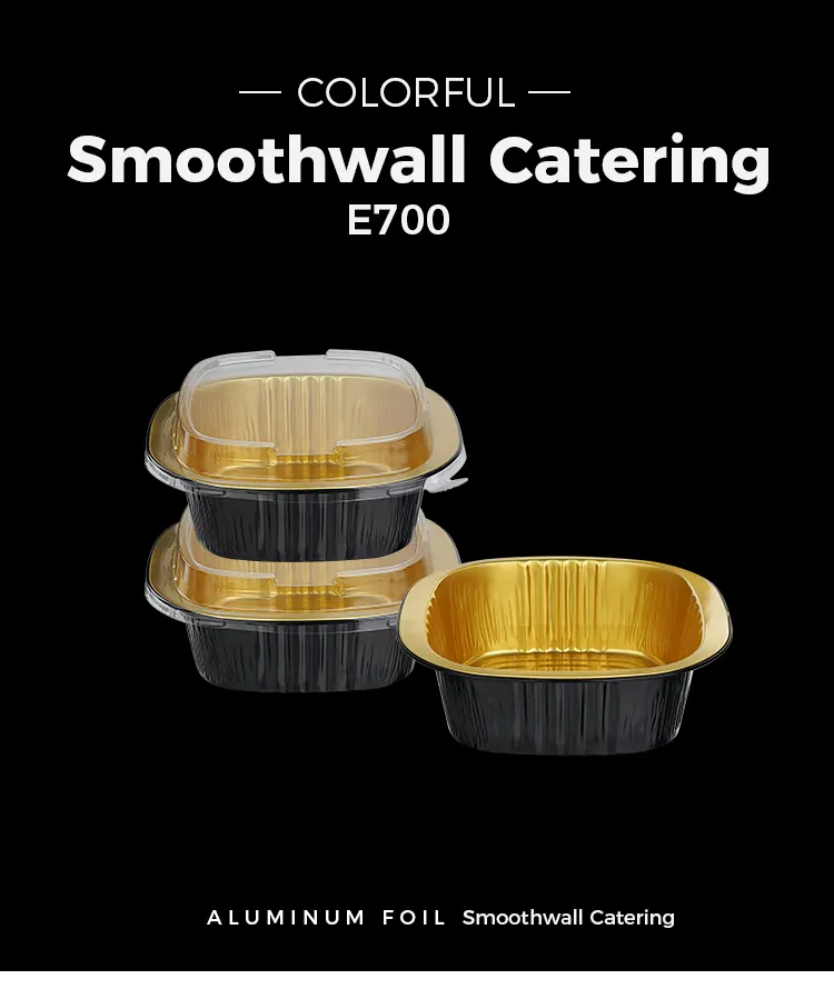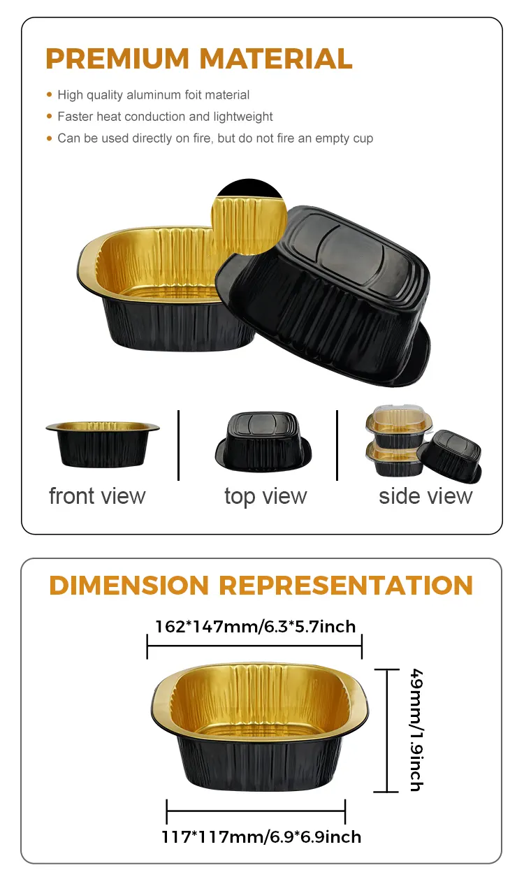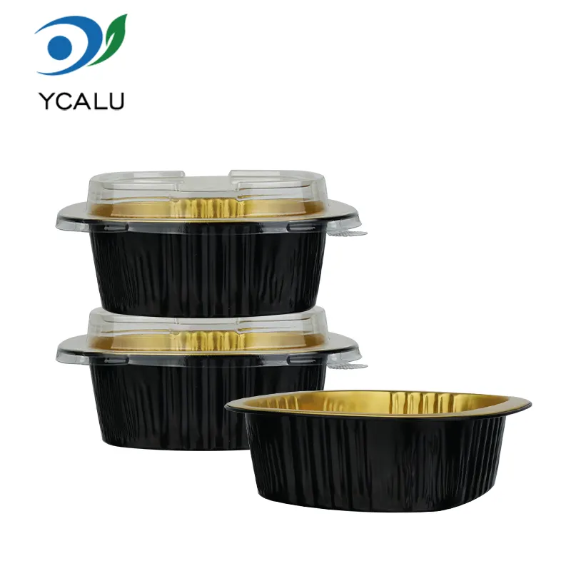 ​Yunchu Aluminiumsfolieleverandørs engangs binaural firkantede æske sort guld lysvæggede aluminiumsfoliebeholdere er lavet af fødevaregodkendt 8011 aluminiumslegeringsfolie. De er blevet behandlet med højtemperaturudglødning og steriliseringsprocesser for at danne et tæt oxidlag på overfladen. De har ingen tungmetaller og ingen lugt. De kan være i direkte kontakt med alle typer fødevarer og forhindre udfældning af skadelige stoffer ved høje temperaturer. Uanset om de bruges til at opbevare varme retter, kolde retter, desserter eller saucer, kan de beskytte fødevaresikkerheden og overholde flere sikkerhedscertificeringer såsom FDA og SGS, hvilket gør hver bid mere sikker. Det unikke sorte guld-lysvægdesign bryder den monotone tekstur af traditionelle aluminiumsfoliebeholdere. Den mat sorte guldbelægning og glatte vægoverflade giver en avanceret følelse. Det har ikke kun et enestående udseende, det kan også effektivt blokere lys og ilt, forsinke oxidationen af ​​mad, fastlåse madens aroma og fugt, undgå lugtoverførsel og bevare den originale smag af mad i lang tid. Den glatte vægoverflade har ingen riller eller rynker, hvilket gør den mindre tilbøjelig til at opdrætte bakterier og er nem at rengøre. Det kan også bedre tilpasse sig printtilpasning og hjælpe cateringmærker med at forbedre deres anerkendelse og kvalitet.