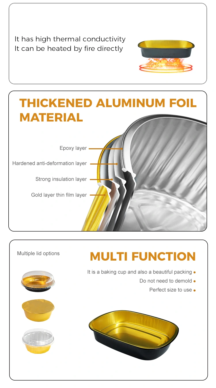 ​Yunchu Aluminum Foil Supplier Disposable black gold catering Rectangular Aluminum Foil Containers is suitable for large-volume catering and takeaway industries, especially suitable for baking, catering chains and self-service chains and other scenarios, the product is made of 8011 food-grade aluminum foil material, the height is low and suitable for some turkey, grilled fish, stew and other foods with many ingredients to Sted, kan bruges med aluminiumsfolieforseglingslåg og kæledyr fuldt gennemsigtigt låg, med fremragende tætningsydelse, høj temperaturresistens og olie- og lækageforebyggelsesfunktion. Det er vidt brugt i forskellige scenarier såsom mademballage, opvarmning, køling og afhentningslevering. Overfladen vedtager et let vægdesign med et fladt og glat udseende, hvilket er praktisk til automatisk tætning af varmeforseglet film og derved forbedrer emballageeffektiviteten.