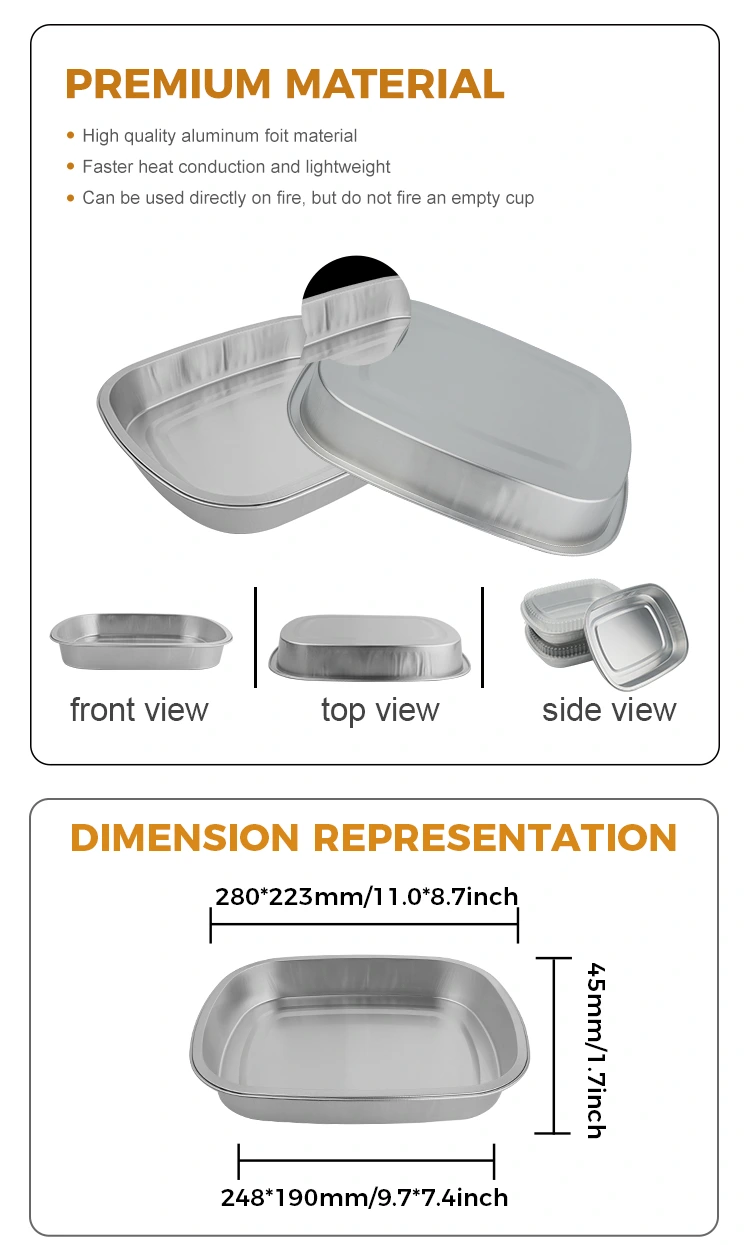 Yunchu er en erfaren Kina-kvalitets engangs-catering takeaway sølv firkantede aluminiumsfoliebeholdere leverandør. Disse engangs sølvfirkantede aluminiumsfoliedåser fødevarebeholdere besluttede friskheden, sikkerheden og leveringen af ​​maden, som direkte bestemmer forbrugerens tilbagekøbsintention og forhandlerens brandomdømme. Denne aluminiumsfoliebeholder, med dens dobbelte fordele med hensyn til materiale og design, matcher nøjagtigt kernebehovene i takeaway-scenen, og styrker cateringhandlere, så hvert måltid kan nå forbrugerne frisk og sikkert.