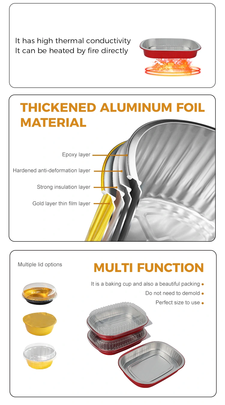Bagerier og vestlige restauranter kan bruge røde engangsmadkasse firkantede aluminiumsfoliebeholdere til at sælge grillede durianer, bagte søde kartofler og grillede kødfade. Den gyldne tekstur forbedrer produktkvaliteten. Kunder kan varme og spise dem direkte uden yderligere belægning. Takeaway-fødevarehandlere bruger det til at levere bagt ris, grillede kyllingevinger og andre retter. Aluminiumsfolien låser temperatur og friskhed. Selv en time efter levering forbliver maden varm, og suppen lækker ikke.