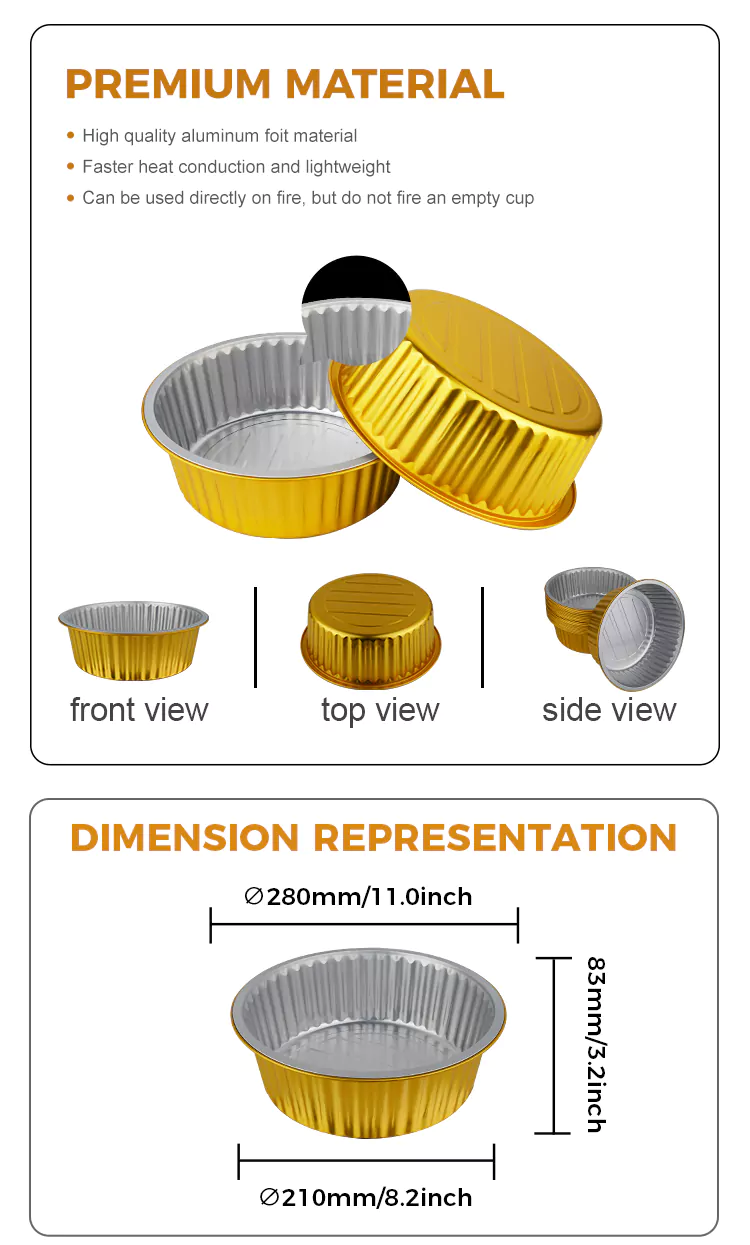 Yunchu aluminiumsfolie leverer dig engangsbeholdere af høj kvalitet, runde og store guld-aluminiumsfolier. Vi har valgt et iøjnefaldende udseende design, hvilket gør dem både af høj udseende niveau og praktiske. Applikationsscenarierne omfatter hjemmekøkkener, cateringvirksomheder, bagestudier osv.