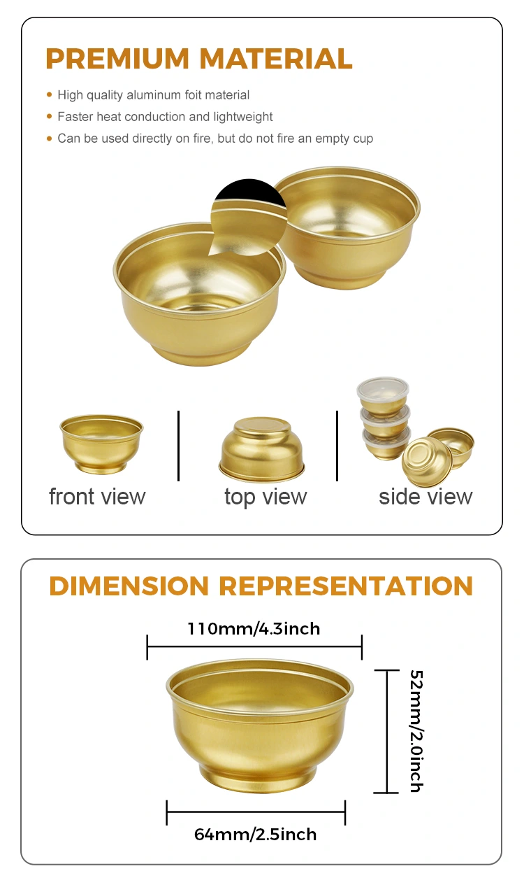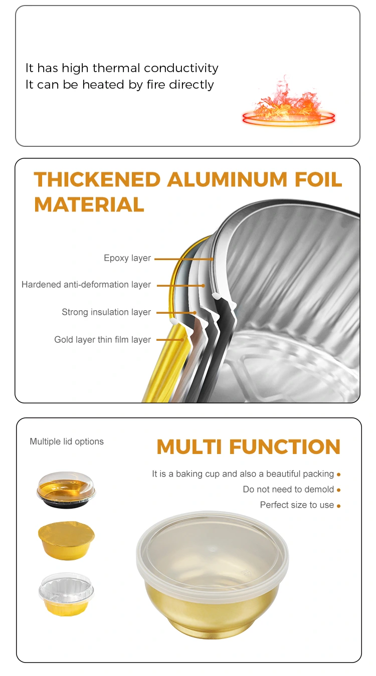 Yunchu aluminiumsfolie leverandør, engangsrunde små guldskål aluminiumsfoliebeholdere, fortykket aluminiumsfolie, høj hårdhed, ikke let deformeret, kan forsegles uden lækage, stærk varmebestandighed, genanvendelig, tjener som både en form og emballage, høj -temperatur sterilisering aluminium foliepakning pakning er sikker, hidt Dampet, kølet, frosset og kan genanvendes. Madkvalitets PE-indre membran, metalmateriale parret med fødevarekvalitet PE indre membran, farveløs og lugtfri tyk krukke-krop gør den lille krukke ikke let deformeret, hvilket giver god beskyttelse, stærk forseglingssikkerhed og pålidelighed, flaskehætten tæt kombineres med flaske-krop, stærk tætning opretholder freshness af produktet i længere tid, helt nye materialer, der er sikre, miljøvenlige og lugtløse. Disponable Round Small Gold Bowl Aluminiumsfoliebeholdere er vidt brugt i forskellige fødevareindustrier, såsom fødevarefabrikker, slikfabrikker, tørrede frugtfabrikker, bagerier, specialiserede fødevarebutikker og tørrede frugtsorteringsbutikker osv. De bruges til at holde mad, slik, honning, tørrede blommer, tørrede frugter, alderen mandarinskal, solid, flydende og fast essens.