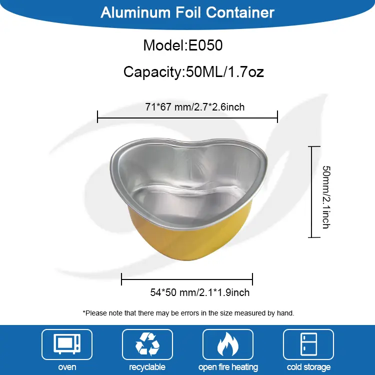 Yunchu aluminiumsfolie leverandør hjerteformet stege glatvæg aluminiumsfolie containere E050 er lavet af sikkerhedsmaterialer i fødevarekvalitet, i tråd med de fødevarekontaktstandarder, der har passeret ISO1900-certificeringen og EU SGS-certificering, med god sejhed, let at frigive fra formen, ingen rengøring, unikt udseende og varmt hjerteformet strukturdesign, der effektivt kan forbedre den tilsatte værdi og tiltrækning af den tiltrækning af den tiltrækkende værdi af den. Det er velegnet til udstyr med høj og lav temperatur, såsom bageplade, luftfryere, køleskabe osv., Med varmebestandighed op til 250 ° C, lav temperatur op til -50 ° C, som kan bages og frosset opbevaret direkte i containeren, reducerende rengøringsomkostninger og kan bruges med låg, som er smuk og let at vise, egnet til supermarkeder, stor-scale-festivalsteder, buffeter, osv. Env. Med en 100% materiel genanvendelighedshastighed kan denne hjerteformede bagning af lysvægget aluminiumsfoliebeholder bruges i: bagning af hjerteformede kager, Valentinsdag, moderkompleks, kagedisplay, håndværksværksted, til takeaway-køling. Øvre diameter: 88*82 mm (3,4*3,2 inches), 70*65 mm (2,7*2,5 inches), højde: 30 mm (1,1 tommer), kapacitet: 100 ml (3,5 oz).