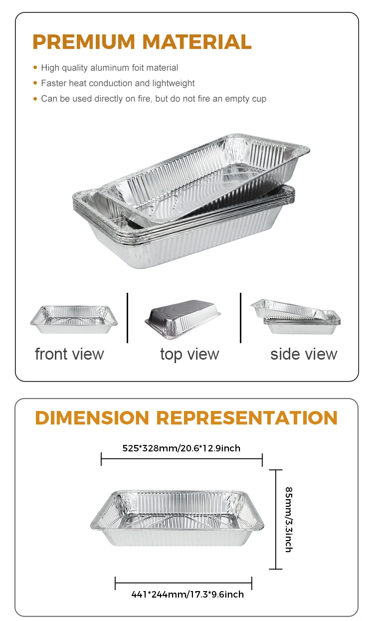 Yunchu aluminiumsfolie Engros model 63200 Stor kapacitet udendørs bageplade sølv aluminiumsfoliebeholdere, egnet til store ovne, retort ovne, grillgriller og andet udstyr. Den store kapacitet udendørs bagepan sølvfoliebeholder på dette produkt kan opvarmes ved høj temperatur for at fremstille store kager, og maden kan placeres direkte på bagepladen for at damp og bages efter vilje, ikke-klæbrig plade, ikke brændt, kan være direkte i kontakt med åben flamme, sikker og pålidelig, ingen grund til at bekymre sig om sikkerhedsspørgsmål. Derudover er produktet meget varmebestandigt, ikke bange for varm luftcirkulation, aluminiumsfoliebeholder er resistent over for høj temperatur, meget modstandsdygtig over for bagning, ikke let at brænde og ikke let at bryde. Det har gennemgået en streng produkttest fra virksomheden for at sikre, at produktet er sikkert at bruge.