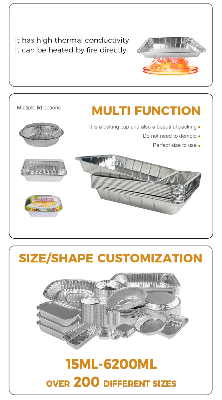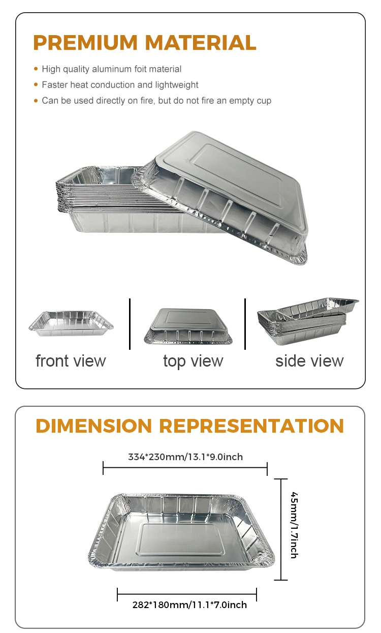 Yunchu aluminiumsfolie leverandør stor grillet fisk takeaway sølv aluminiumsfolie containere, opfylder en række forskellige madlavningsbehov, der er egnede til forskellige lejligheder, såsom luftfryers, grillgrill, rotisserie ovne og fremstilling af skaldyr. Denne aluminiumsfoliebeholder er specielt designet med en hævet kant for effektivt at forhindre mad i at spildes og klæbe fast på gryvæggen og beskytter panforingen med flere lag, hvilket er praktisk og bekymringsfrit. Det er lavet af fødevarekvalitet 8011-0-materiale med en varmebestandig temperatur på op til 520 ° C, ikke svidd eller ødelagt, og det fortykkede materiale gør det ikke let at deformere. Aluminiumsfolieboksen er fortykket som en helhed, så du kan nemt hente den efter madlavning uden at bekymre dig om deformation under brug. Hemmed -designet gør det behageligt at holde, og kanterne afrundes, så du behøver ikke at bekymre dig om at ridse fingrene. De glatte kanter suppleres med PET fuldt gennemsigtige låg og aluminiumsfoliefolie låg, hvilket gør dem mere egnede til en række forskellige tilberedningsmetoder.