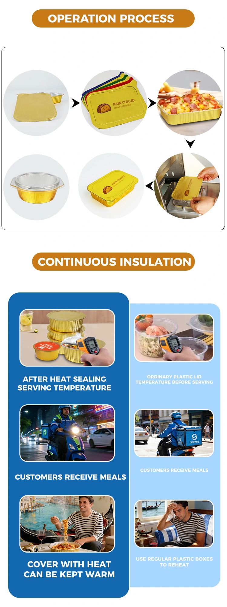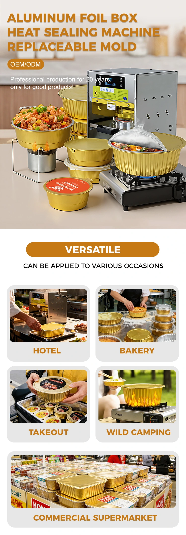 Mere kontrollerbare omkostninger: Kombinationen af ​​manuel varmeforseglingsmaskine med guld aluminiumsfoliebeholdere imødekommer de to store krav til "emballagebeholdere + forseglingsudstyr", hvilket eliminerer behovet for separate indkøb og reducerer indkøbsomkostninger. Samtidig reducerer det eftersalgstab forårsaget af beskadiget emballage og fødevarefordærvelse og øger indirekte avancen.