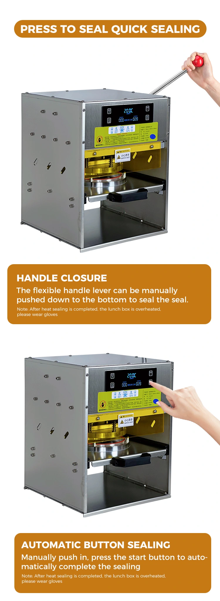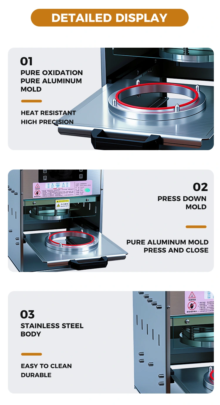 Mere effektiv: Ingen grund til at parre med separate forseglingsfilm. Madkasserne og varmeforseglerne er klar til brug med det samme. Manuel drift kræver ikke ventetid på forvarmning. Små batchordrer kan behandles hurtigt, og store ordrer kan også støt avanceres. Det kan nemt håndtere scenarier som spidsbelastningstider og pludselige stigninger i festivalordrer.