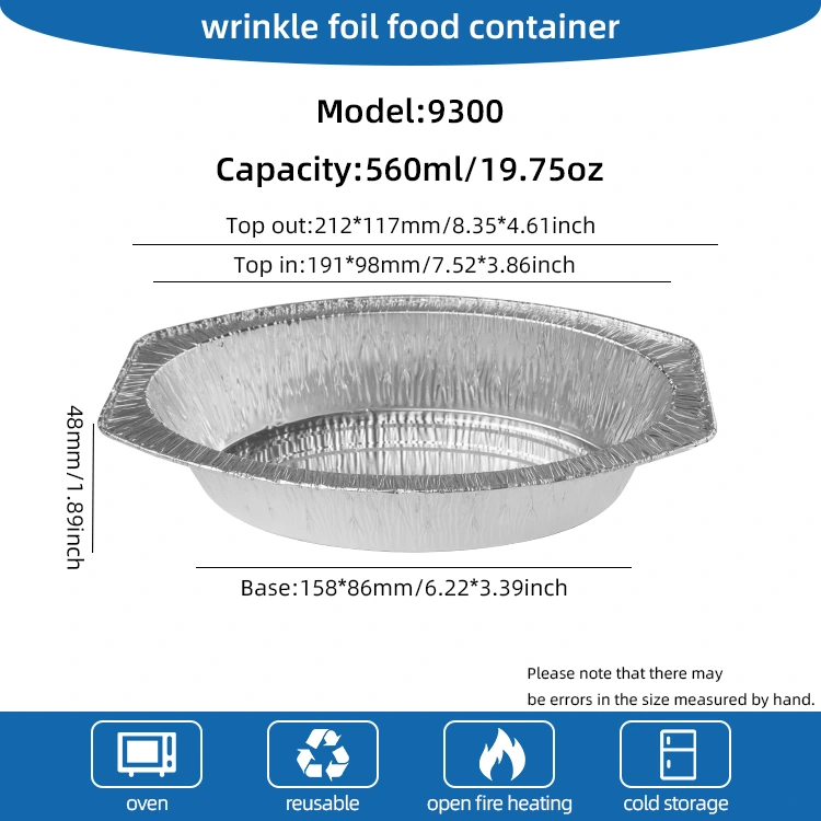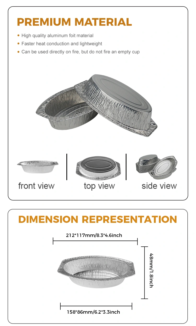 Yunchu aluminiumsfolie oval bagt brød sølv aluminiumsfoliebeholdere kan bruges direkte i ovnen eller grillen, hvilket er meget praktisk. Når man kun vejer 5,9 gram, er det let at stable pænt, effektivt spare plads til transport, restaurantbelægning og køkken. Produktets lette vægproces gør overfladen glat og ryddig, og det sølvlyse udseende er ikke kun smukt og elegant, men også praktisk for store supermarkeder at mærke og scanne koder.