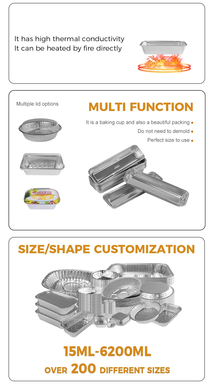 Funktioner: Engros i frokostboksen er lavet af 8011 aluminiumsfoliemateriale, som har en god varmebevaringseffekt og kan opretholde temperaturen på maden, hvilket gør maden mere lækker og lækker. Derudover har vores rektangulære BBQ sølv aluminiumsfoliebeholder også en varmeisoleringsfunktion og kan matches med aluminiumsfolie låg og kæledyr plast låg.