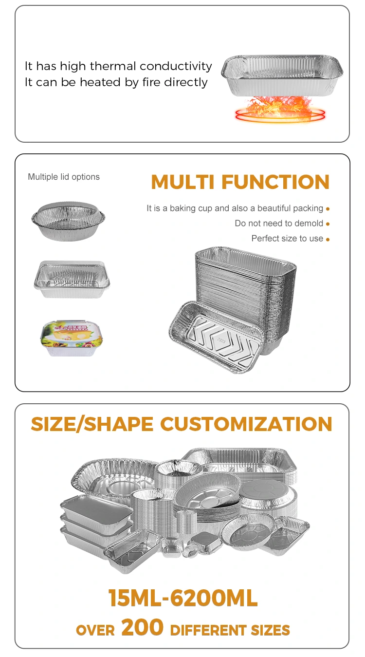 Funktioner: Frokostboks Engros 8011 Aluminiumsfoliemateriale er lavet af god varmebevaring, som kan opretholde temperaturen på mad og gøre maden mere lækker. Derudover har vores rektangulære grillsølv aluminiumsfoliebeholder også en varmebeskyttelsesfunktion, som kan matches med aluminiumsfoliepapirlåget og kæledyr plast låg, hvilket er praktisk for dig at tilpasse dit logo, yderligere uddybe kundeindtryk og forbedre dit brandbillede.