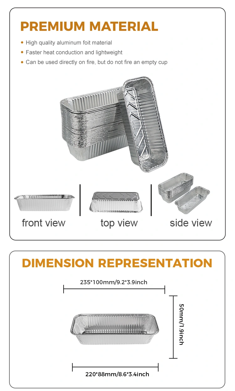 Den rektangulære brødbakke bageplade sølv aluminiumsfoliebeholdere leveret af Yunchu aluminiumsfoleringsleverandør fås i forskellige størrelser og specifikationer, der er egnede til alle slags potteudstyr. Uanset om det er en stor grill eller en lille ovn, kan det håndtere det let. Det findes i forskellige størrelser og kan imødekomme behovene hos forskellige åbne flamme grill, hvad enten det er en udendørs grill eller en midlertidig anvendelse som en skål, der vil ikke være noget problem.