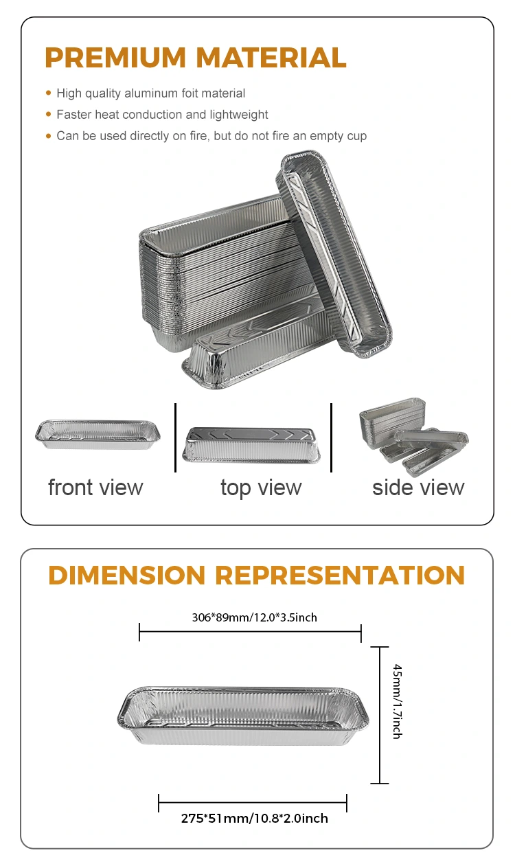 Den rektangulære brødbakke bage sølv aluminiumsfoliebeholdere leveret af Yunchu aluminiumsfoleringsleverandør er lavet af materialer i fødevarekvalitet og er velegnet til en række anvendelsescenarier. Dette produkt er især velegnet til grillning og bagningsmæssige formål, såsom at fremstille lange brød eller bagning. Uanset om det er til kulgrillning eller som en afhentningsfelt, er det perfekt til brug.