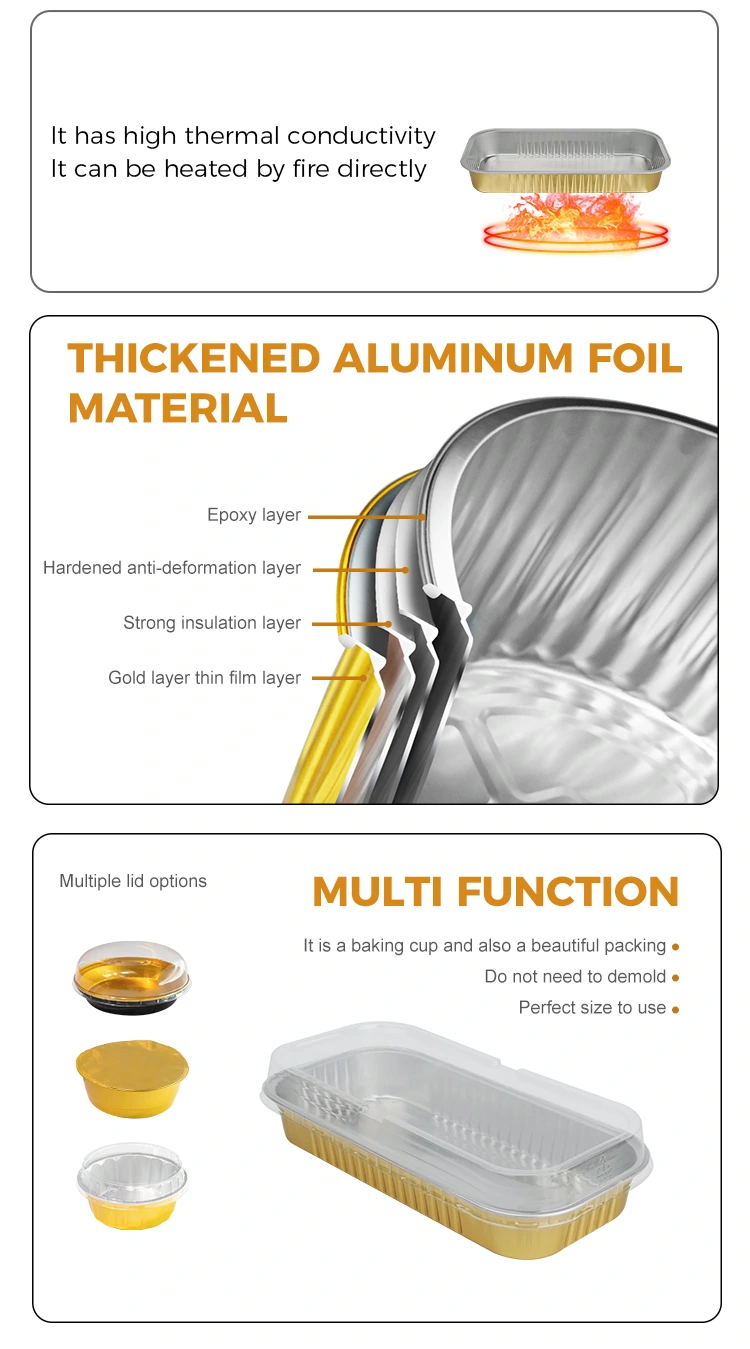 Catering takeaway: velegnet til levering af lette måltider i vestlig stil og bagte desserter. Det gyldne udseende forbedrer brandets image, og aluminiumsfoliematerialet kan også spille en vis rolle i varmekonserveringen.