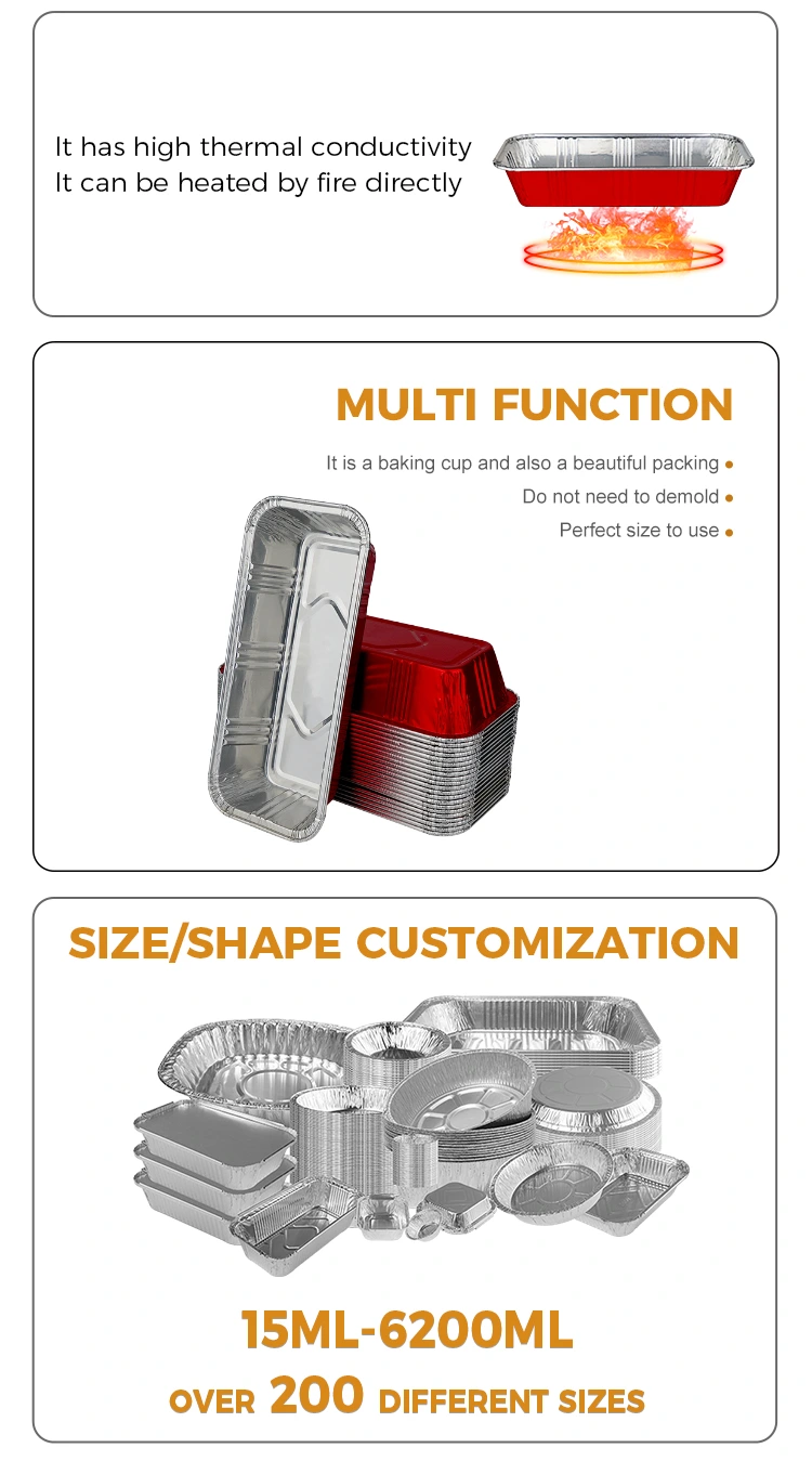 YunChu Aluminiumsfolie 's rektangulære røde bageri catering Sølv aluminiumsfoliebeholdere bages uden oliebørstning, nem udtagning af formen og undgå at klæbe til bagepladen; Ved opbevaring skæres brødet og pakkes i æsker. Efter afkøling er det mindre sandsynligt, at det absorberer smag. Den er let og varm, når den tages ud. Vi har også tilføjet en funktion, der kan opvarmes ved høj varme i en mikrobølgeovn, hvilket gør den mere praktisk for dig at bruge. Bageriet kan bruge det kommercielt. Sølv-aluminiumsfoliekassen har en enkel metallisk tekstur og kan direkte bruges som emballagebeholder til færdige produkter. Efter udskrivning af mærkelogo, produktionsdato og opbevaringsmetode kan det ikke kun forlænge friskhedsperioden for brød (1-2 dage længere end almindelige plastikposer ved stuetemperatur), men også øge produktets genkendelse og tiltrække forbrugere til at købe. I mellemtiden kan aluminiumsfoliekasserne stables til opbevaring, hvilket sparer lagerplads til bageriet. Når du tager dem ud, er der ingen grund til at pakke dem ud separat, hvilket fremskynder serveringseffektiviteten. Til buffetscenarier kan den varmebevarende egenskab af aluminiumsfoliekassen holde brødet varmt på spisebordet (med et temperaturudsving på højst 5 ℃ inden for 2 timer), hvilket undgår gentagen opvarmning, der kan forårsage, at teksturen bliver tør og hård. Det individuelle kassedesign gør det bekvemt for gæsterne at tage efter behov, hvilket reducerer hygiejnerisici forårsaget af gentagne berøringer med tang. Det kan også bremse oxidationshastigheden af ​​brød udsat for luften og reducere spild.