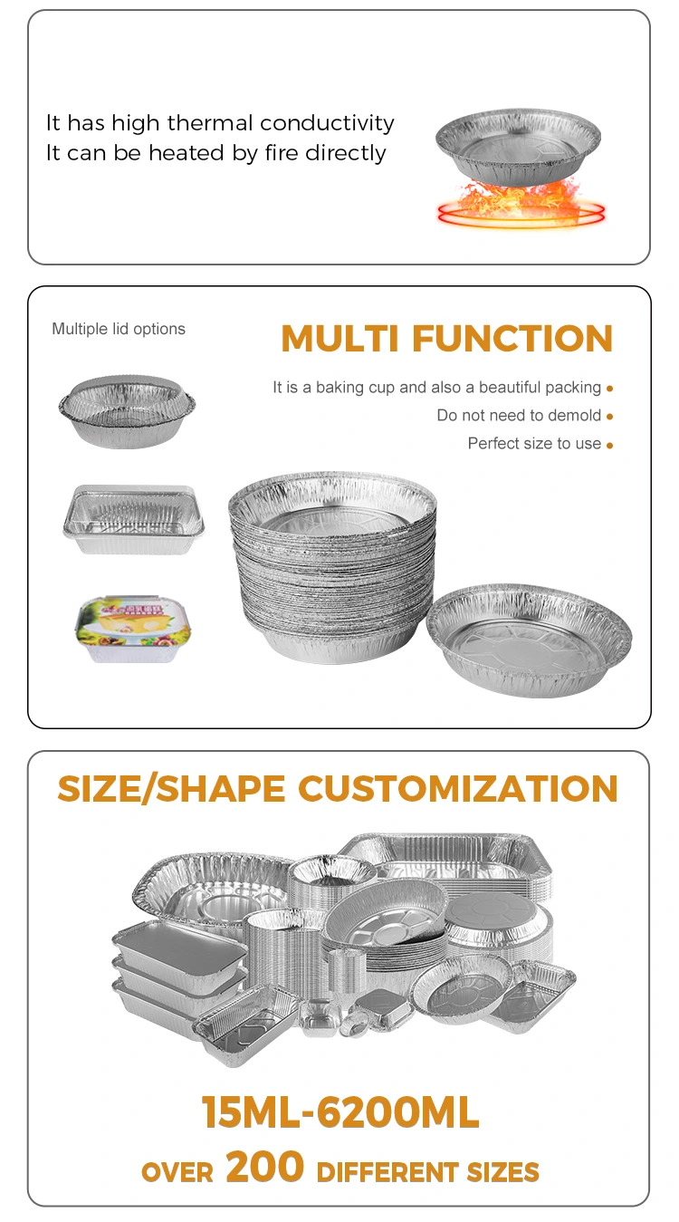 Leverandør af aluminiumsfolie -leverandøren producerer engros Round Air Fryer ovn Sølv aluminiumsfoliebeholdere, sølv aluminiumsfolie Fødevareklasse -certificering, materialet er blevet fortykket, direkte kontakt med fødevaresikkerhed og ro i sindet, kan direkte bage mad, enkel og praktisk at bruge, så længe det er påhvilet i luftfrivet eller æg. -20 ° C ~ 250 ° C kan ikke indsættes eller ødelægges, vælger tykkere materialer af høj kvalitet, miljøbeskyttelse af fødevarekvalitet og forureningsfri, brug mere sikret. Den runde luftfrity ovn sølv aluminiumsfoliebeholdere er velegnet til scener som restauranter, kantine catering, kædebutikker, kølet mad, takeaway osv. Uanset om det er til engros eller detailbrug, har denne bagepande fået dig dækket. Bagebakken har en vis bærende kapacitet og holdbarhed og kan opretholde sin form, selv når den er stablet, og er ikke let at deformere under transport. For yderligere at forbedre brugeroplevelsen kan brugerne også vælge at bruge den med aluminiumsfolie låg og fuldt gennemsigtige kæledyrslåg.
