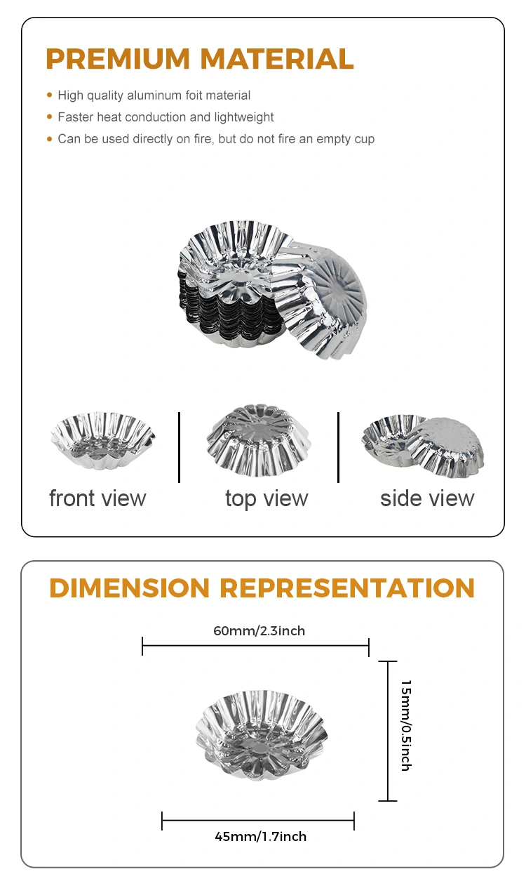 Yunchu Aluminiumsfolie Leverandør Round Egg Tart Toy Baking Silver Aluminium Folie Food Container, for at møde forskellige smag, en række størrelser at vælge imellem, aluminiumsfolie er sikker og ikke-giftig, lavet af aluminiumsfolie materiale, med god termisk ledningsevne, sikker og ikke-toksisk til en række anvendelser, bedre brug, nem non-stick-mur, glat cupvæg, Bamboo Skewerglårgl. Plukket, let at spise, stærk termisk ledningsevne, aluminiumsfoliemateriale er ikke let at deformere, vandtæt/oliebesæt Snacks, bølgeforme, det færdige produkt er smukt, ikke let at deformere, langvarig dampning, bagning vil ikke deformere eller revne, er befordrende for produktets udseende for at afslutte effekten.
