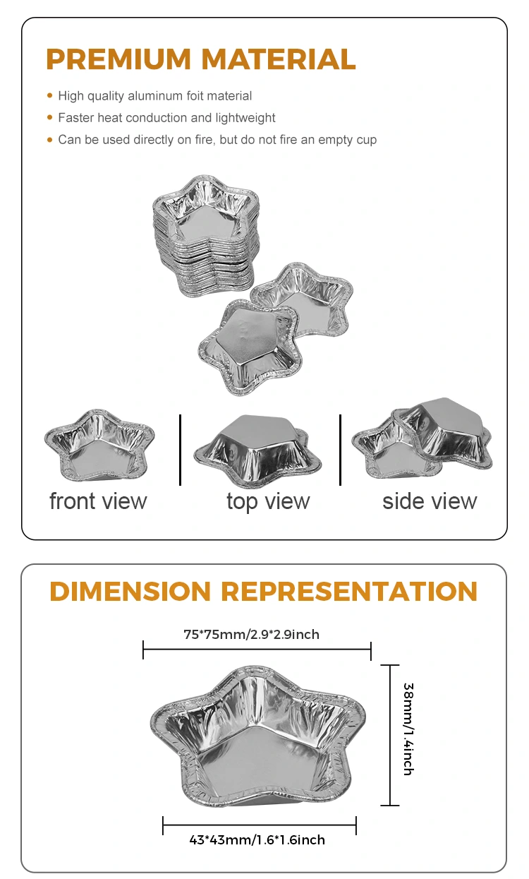 • Stjerneformede tærtekopper af aluminiumsfolie til bagning af madbeholder af aluminiumsfolieStjerneformede tærtekopper af aluminiumsfolie til bagning af madbeholder af aluminiumsfolie