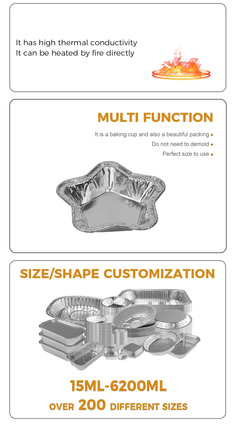 Yunchu Aluminiumsfolieleverandør Stjerneformede aluminiumsfolietærtekopper til bagning Aluminiumsfoliefødevarebeholder er en højkvalitets bagebeholder af aluminiumsfolie. Dette produkt er praktisk og løser effektivt problemer ved fremstilling af tærter eller små fødevarer, såsom opvaskepander og fedtrester. De indvendige og ydre vægge i bunden af ​​de stjerneformede aluminiumsfolietærtebægre til bagning Aluminiumsfolie-madbeholder er designet til at være glatte, hvilket forhindrer klæbning efter bagning og undgår svidning i bunden.